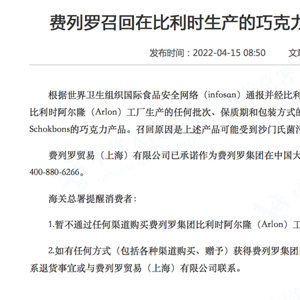 4月15日,海关总署发布消费提示,根据世界卫生组织国际食品安全网络通报并经比利时驻华使馆确认,意大利巧克力生产商费列罗集团宣布在全球范围内召回其在比利时阿尔隆(Arlon)工厂生产的任何批次、保质期和包装方式的品类为Kinder Surprise、Kinder Mini Eggs、Kinder Surprise Maxi和Kinder Schokbons的巧克力产品。召回原因是上述产品可能受到沙门氏菌污染。
