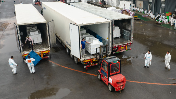两大市外中转站的具体操作步骤为:来自全国各地的保供物资抵达浙江、江苏的中转站进行消杀后,再换上上海方的运输车头,即采用甩挂接驳的“无接触”作业方式转运至上海指定地点。