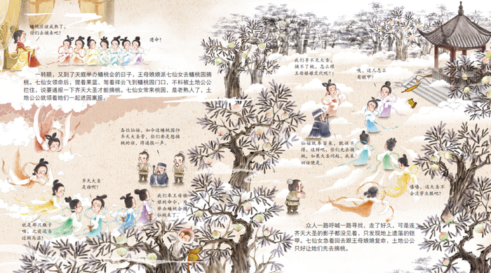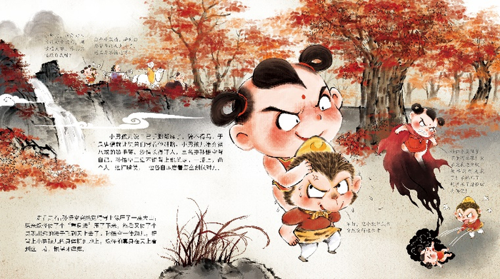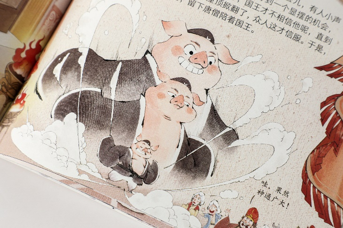 “这套《西游记》不仅运用了中国传统美术中‘样式’‘近小远大’等绘画手法,还展示了东方绘画中墨色浓淡表现立体感的皴法,以及近景、中景和远景的构图方式,让孩子可以直观的感受到东方审美主观一致、浪漫天真的传统特性。”