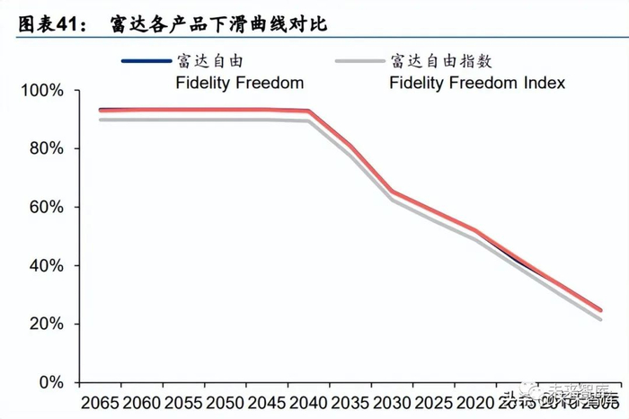 较高的起始股票占比+审慎的下滑曲线(Glide Path)设计。下滑曲线(Glide Path)设计 是养老金产品的核心竞争力之一。富达的下滑曲线将权益资产细分为美国权益资产和海外 权益资产,固定收益资产细分为债券资产和短期现金资产。曲线设计采取穿越型,即在退 休日期后的 10-20 年权益配置才达到最保守的水平。以自由系列为例,在投资者达到 45 岁 左右之前,资产配置都保持 90%的股票基金占比,此后股票占比逐渐减小,并在投资者达 到 85 岁左右时降至最低,此时股票基金占比约为 25%。自由系列基金近年的业绩归因显 示,权益资产下滑轨道对基金业绩贡献的占比最大,同时,子基金的业绩表现也给自由系 列带来正面贡献。