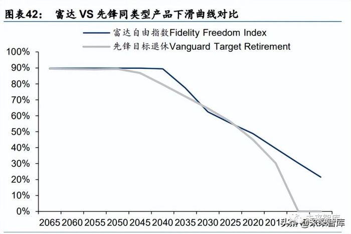 差异化产品,差异化配置策略。从基金类型看,退休收入基金的股票配置明显较低。以 Target-Date 2020 为例,自由系列在投资者退休前 的 50-25 年内以 90%股票基金、10%债券基金的比例配置资产,在退休前 25 年逐渐降低 股票基金的比例,提高债券基金和短期基金的占比,并在退休时点达到 50%左右的股票基 金配比;退休管理和简易 RMD 系列则以退休年龄为起始时点,分别在投资者 60 岁时配置 小于 50%和小于 65%的股票基金。从主动策略调整看,自由和自由混合系列均允许基金 经理在偏离原有下滑曲线 10%以内的范围内进行资产配置的主动调整,且可以在基金总资 产 10%的范围内增加原有下滑曲线中尚未包含的资产类型,但自由指数系列由 100%指数 基金构成,不允许此类调整。