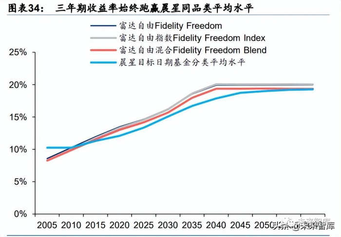 目前,富达自由指数系列投资者级别(无最低购买限额)的费用率仅有 0.12%,机构级别 (最低购买限额 500 万美元)的费用率为 0.08%,与先锋目标退休系列相同,处于行业领 先水平。