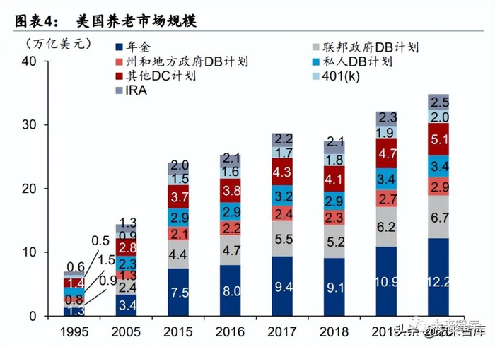 第二和第三养老支柱的持续扩容,助力推动美国共同基金的普及与繁荣。美国于 20 世纪 六七十年代逐渐建立起成熟完善的养老体系,以 401K 计划与 IRAs 为代表的长期属性的 养老金通过计划管理员投资于股票、债券、共同基金和货币市场工具,成为推动共同基金 行业以及资本市场壮大的重要支撑。