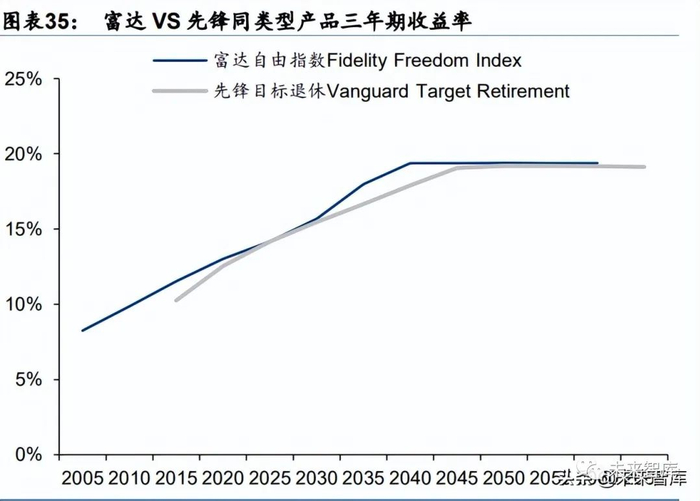 投向资产多元化,持仓分散化。富达重视投资资产的多元化发展。从资产品类来看,富达 在配置资产中增加多品类的债券以稳定回报率。例如,富达在其所有目标日期基金中均增 加了国际债券的配置比例,以降低汇率风险;针对临近退休的投资者,则在其基金投资组 合中提高通货膨胀保值债券(TIPS)的配置比例,以提高通胀压力期的回报率。从持仓基 金数量来看,富达目标日期基金持仓较为分散,以富达自由 2030 为例,其持有的富达基 金高达 34 个,其中资产配置中 33.63%为债券基金,65.41%为股票基金。