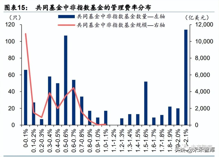 基金费率略低于行业平均水平,权益产品费率凭借主动管理优势相对较高。公司 2021 年 共同基金平均管理费率为 0.35%(以 2021 年末各只基金 AUM 加权测算),非指数基金类 的共同基金平均管理费率为 0.50%,较行业平均水平略低。从管理费率分布来看,共同基 金中 49%的产品费率均在 0-0.6%区间,非指数类基金中 44%的产品费率均在 0-0.6%区间。此外,公司在加拿大发行的近半数共同基金,费率高于 2%,对平均费率正向贡献。