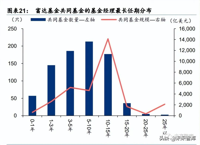 为应对基金经理更换带来的问题,2014 年富达创建了由不同部门经理管理的多经理基金,公 司会任命一名与牵头经理一起工作的基金经理,若其后牵头基金经理发生变化,会接管该基 金,以最大限度地减少离职的影响。根据晨星统计,截至 2021 年末,53%以上的共同基金的 基金经理最长任期都达 5 年以上;52%以上的非指数基金的基金经理最长任期达 5 年以上。