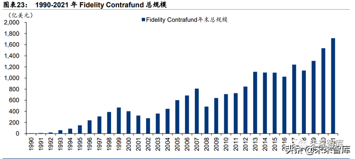 1967 年富达推出 Fidelity Contrafund,为主动权益管理基金,初始投资目标是通过投资于 不受欢迎的股票或行业来采取逆势投资。1990 年以来,威廉·丹诺夫(William Danoff) 担任其基金经理,并利用 Fidelity 由 60 多名国内股票分析师组成的团队进行的深入研究。Danoff 上任后,将 Contrafund 目标转变为通过挑选良好的成长股来实现资本增值。根据 晨星统计,2021 年末,Fidelity Contrafund 总规模达 1717 亿美元,单基金规模排名行业 领先。富达还于 2008 年推出 Contrafund K 份额,用于提供给由富达提供簿记服务的雇主 养老金或健康储蓄账户;并于 2017 年推出费率更低的独立新基金 Contrafund K6,同样用 于提供给由富达提供簿记服务的雇主养老金或健康储蓄账户。