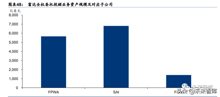 全权委托投顾业务主要由富达的三家子公司提供。其中,个人投顾服务主要由投顾子公司 Fidelity Personal and Workplace Advisors(FPWA)提供,主要提供 4 种类型的投顾服务, 包括定位大众富裕人群的 Fidelity Go 和 Fidelity Personalized Planning & Advice、定位高 净值人群的 Wealth Services 和 Fidelity Strategic Disciplines。机构资产管理公司 Fidelity Institutional Asset Management(FIAM)为机构投资者提供投资咨询服务,业务板块包括 全权委托投资管理和非全权委托投资管理。Strategic Advisers(SAI)子公司负责富达旗 下所有的实际投顾账户管理和投资组合模型的开发和维护。其业务板块包括:慈善捐赠基 金、注册投资公司、投资计划设计服务以及管理和咨询服务。除此之外 SAI 也有自己的投 顾品牌,直接为机构投资者提供投顾服务。