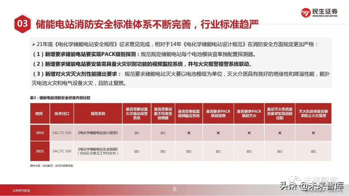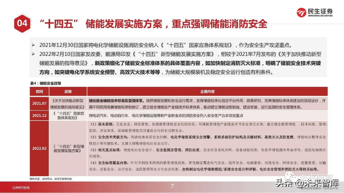 2022年2月10日国家发改委、能源局印发《“十四五”新型储能发展实施方案》,相较于2021年7月发布的《关于加快推动新型 储能发展的指导意见》,新政策细化了储能安全标准体系的具体覆盖内容,如加快制定消防灭火标准,明确了储能安全技术突破 方向,如突破电化学系统安全预警、高效灭火技术等等,为储能大规模装机及稳定安全运行创造有利条件。