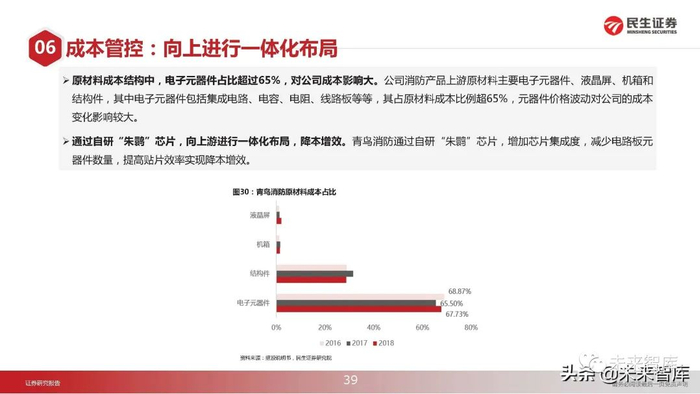 原材料成本结构中,电子元器件占比超过65%,对公司成本影响大。公司消防产品上游原材料主要电子元器件、液晶屏、机箱和 结构件,其中电子元器件包括集成电路、电容、电阻、线路板等等,其占原材料成本比例超65%,元器件价格波动对公司的成本 变化影响较大。