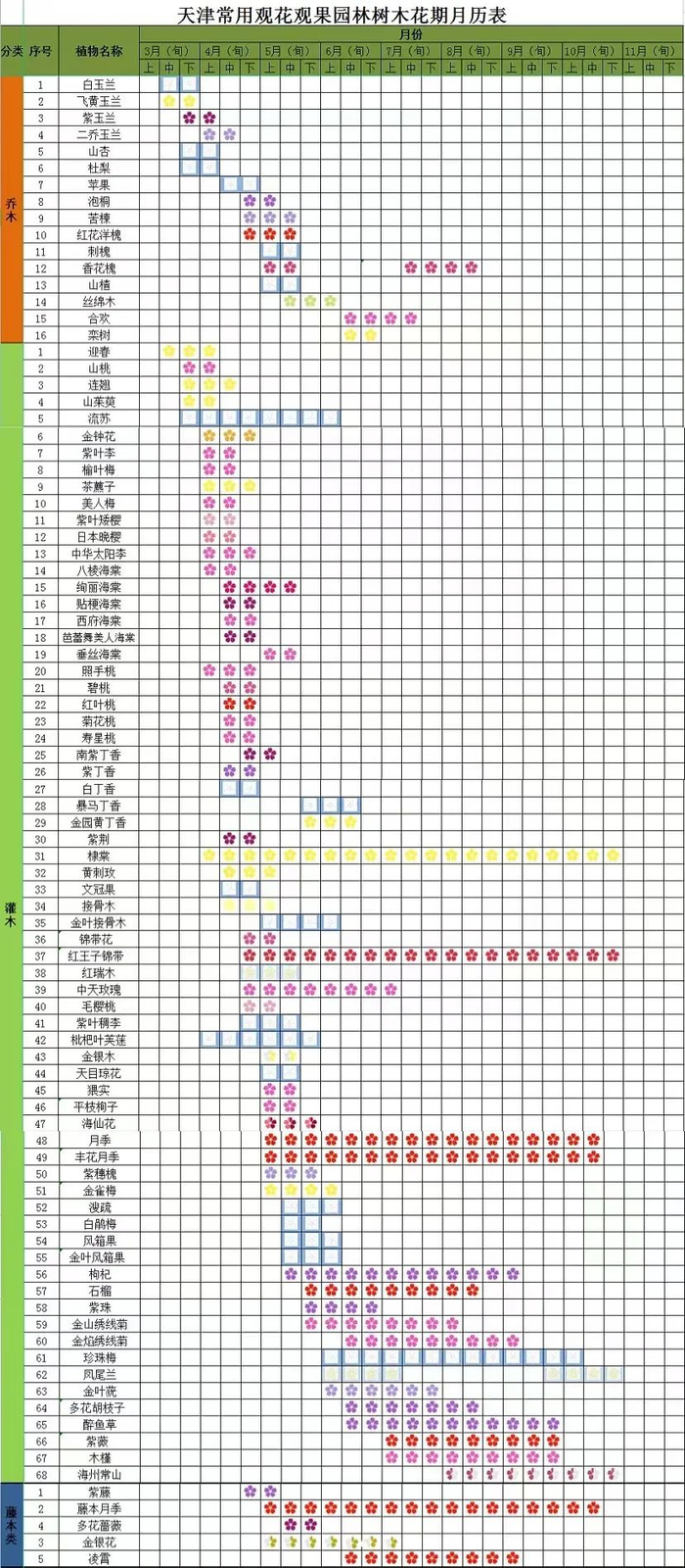 近年来,天津市花苗木服务中心对近百种天津常用的观花观果苗木品种的花期,进行了综合整理,编制了观花月历。