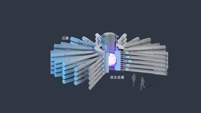 GF公司在卡勒姆的反应堆使用离心机旋转一个充满熔融铅和锂的腔室。离心运动会在这些液态金属中创造出一个空腔,以容纳等离子体。活塞系统将更多液态金属泵入腔室,将等离子体压缩几十毫秒。聚变开始;然后压力释放,这一过程以脉冲的形式重复,周期约为一秒。