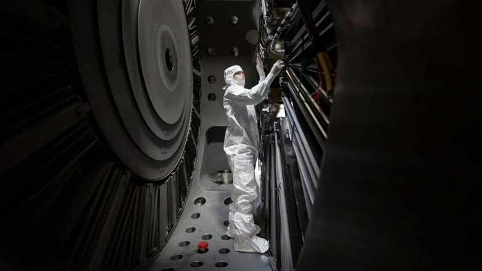 Wendelstein 7-X坐落于德国格赖夫斯瓦尔德,图为一名工程师在Wendelstein 7-X复杂的等离子体容器内部工作。来源:Stefan Sauer/dpa via Alamy