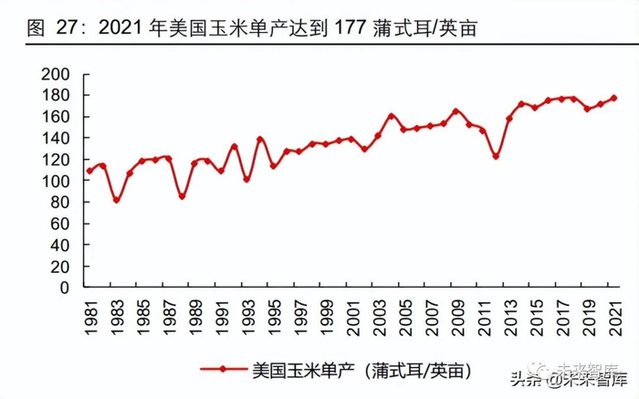 根据 2 月 USDA 对 22/23 年度的展望,预计种植面积略有下滑,但是单产保持增长, 22/23 年度美国玉米产量预计增长 1%。预计种植面积将会从 21/22 年度的 9340 万英亩 减少至 9200 万英亩,收获面积由 8540 万英亩减少至 8420 万英亩,而单产继续增长, 由 177 蒲式耳/英亩增长至 181 蒲式耳/英亩。