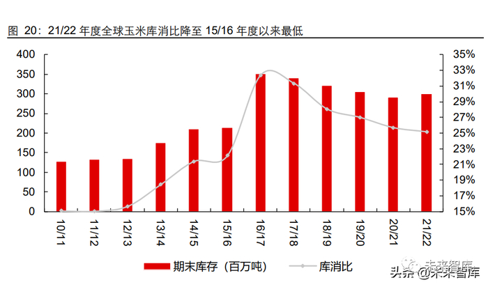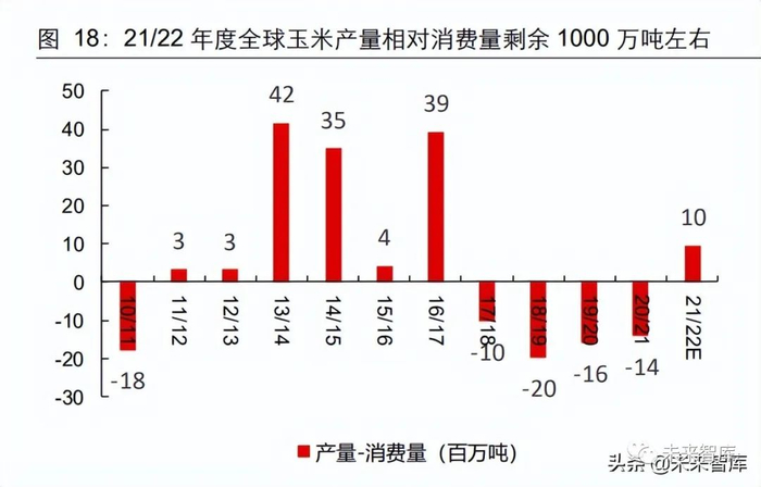 21/22 种植年度全球玉米增产 8300 万吨,供需呈现相对紧平衡状态,全球玉米库消比 为 16/17 种植季以来最低。22 年初至 3 月 18 日 CBOT 玉米价格上涨 26%。美国、中 国、巴西、欧盟、墨西哥、阿根廷、乌克兰是全球前七大玉米生产国,21/22 预计产量 分别为全球的 32%、23%、9%、6%、2%、4%和 3%。本年度美国、中国、巴西、欧 盟、阿根廷、乌克兰分别增产 2500、1200、2700、300、200、1200 万吨。全球玉米需求与产量自 17/18 种植年度以来持续增长,21/22 年度全球玉米产量相对消费量剩余 1000 万吨左右,全球玉米维持紧平衡状态,库消比为 16/17 种植季以来最低。在 USDA3 月供需平衡报告中,对全球产量调高了 80 万吨,主要上调了俄罗斯产量预期 23 万吨, 上调澳大利亚玉米产量预期 105 万吨;下调阿根廷产量预期 100 万吨,下修乌克兰产 量预期 32 万吨。