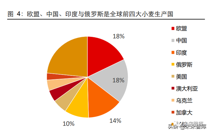 根据各国农作物统计与咨询机构的预测,展望 22/23 年度主要出口国的小麦生产情况, 全球小麦供给情况或进一步收紧。预计美国干旱将缓解,小麦产量增长 800 万吨以上, 而欧盟与澳大利亚小麦产量或下滑,乌克兰地区小麦产量下滑幅度取决于俄乌冲突的时 长与烈度,俄罗斯小麦产量预计增长 500 万吨以上,但是面临着贸易制裁的不确定性, 或影响其小麦出口情况。