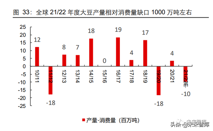 21/22 年度全球大豆减产 1200 万吨,产需存在 1000 万吨的缺口,且库消比降至 13/14 种植年度以来最低。22 年初至 3 月 18 日,CBOT 大豆价格上涨 23%。巴西、美国与 阿根廷分别是全球前三大大豆生产国,21/22 年度预计产量占全球的 36%、34%与 12%。21/22 年度美国增产 600 万吨,中国、巴西和阿根廷分别减产 300、1100 和 300 万吨。年初以来,CBOT 大豆期货价格上涨了 23%,而俄乌武装冲突爆发以来先涨后跌,基本 与俄乌冲突爆发前价格持平,可见市场相对更为担忧南美旱情对大豆供给端的直接影响。
