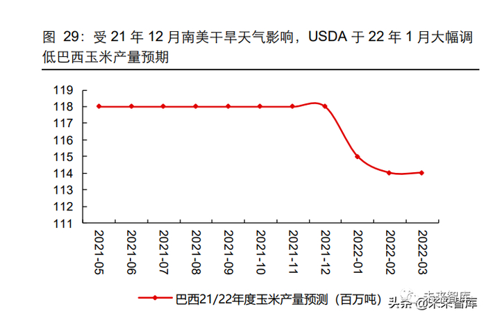 21/22 年度 USDA 预测巴西玉米产量为 1.14 亿吨,相对受干旱与霜冻影响而减产较多 的 20/21 年度增加 31%。20/21 年度受到干旱与霜冻影响,巴西玉米的产量与出口大幅 下滑。21/22 年度的巴西玉米生产主要受到 21 年 12 月的干旱影响,减产幅度小于上一 年度,22 年 1 月 USDA 将巴西玉米产量预期由 1.18 亿吨下调至 1.14 亿吨。