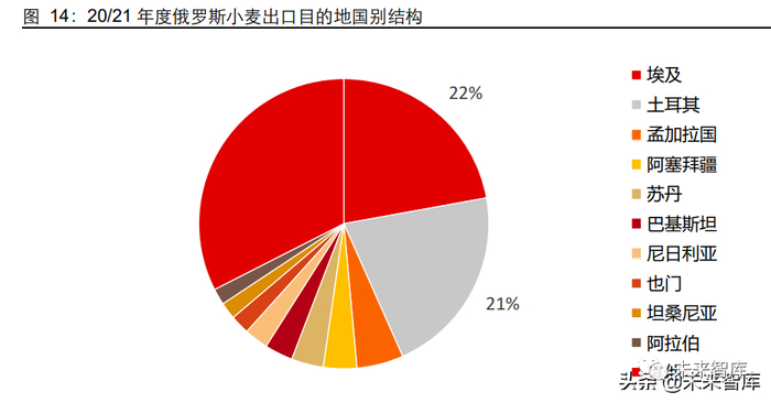 21/22 年度 USDA 预测俄罗斯小麦出口量为 3200 万吨,同比减少 18%。由于俄乌冲突 可能导致俄罗斯农产品出口受限,USDA 在 3 月的预测中调减了俄罗斯小麦的出口量。根据俄罗斯联邦兽医和植物检疫监测局数据,截止到 2022 年 1 月 20 日,俄罗斯在 2021 年 7 月 1 日至 2022 年 1 月 20 日(一般销售年度为 7 月至次年 6 月)出口小麦 2300 万吨,同比下降 21%。从俄罗斯小麦出口的国别比例来看,俄罗斯主要的小麦出口目的 地国家为北非以及亚洲国家。截止 2022 年 1 月 20 日,俄罗斯最大的小麦出口目的地 国为土耳其与埃及,与 20/21 年度相同。根据路透社 3 月 14 日消息,俄罗斯已经禁止 向邻近的欧亚经济联盟国家出口小麦、黑麦、大麦与玉米,主要是由于向这些国家的出 口不受出口配额限制,在配额限制以内依然允许小麦出口。