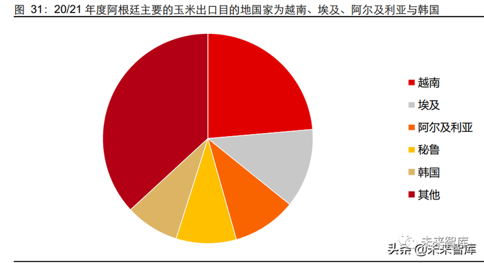 21/22 年度 USDA 预测阿根廷玉米出口量为 3900 万吨,同比减少 4%。20/21 年度巴 西玉米出口大幅减少,阿根廷玉米在这一年度玉米出口量达到 4100 万吨的历史新高, 随着巴西出口量的恢复,预计阿根廷玉米出口小幅下滑 4%,与上一年度基本持平。根 据 UN Comtrade 在 2020 年度的数据,阿根廷主要的玉米出口目的地国家为越南、埃 及、阿尔及利亚与韩国。
