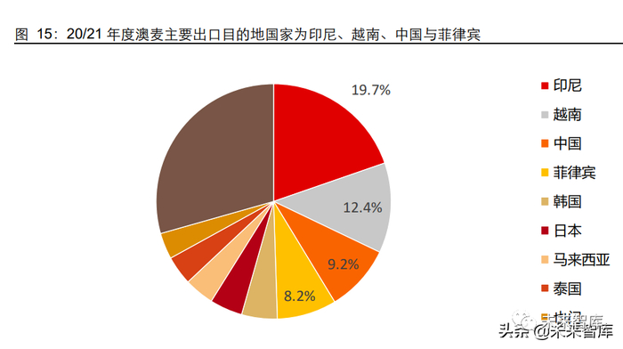 21/22 年度 USDA 预测澳大利亚小麦出口量为 2800 万吨。俄乌冲突后澳麦出口需求进 一步上升。由于俄罗斯、美国与加拿大地区的减产以及出口减少,澳大利亚小麦今年的 出口也创新高,达到 2800 万吨,俄乌冲突后,黑海地区小麦出口的不确定性提升了澳 大利亚小麦的吸引力,USDA 在 3 月预测中将澳大利亚小麦出口预测调升 200 万吨。由 于距离原因,澳麦的主要出口目的地为亚洲国家,根据 20/21 种植年度,澳麦最大的出 口目的地国家为中国、越南、印尼、菲律宾、韩国等亚洲国家。