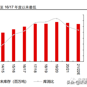 21/22 种植年度预计全球小麦增产 300 万吨,产量相对消费量缺口为 900 万吨,库消比 降至 15/16 年度以来最低,22 年初至 3 月 18 日 CBOT 小麦价格上涨 40%。欧盟、中 国、印度、俄罗斯、美国、澳大利亚与乌克兰是全球前七大小麦生产国,21/22 预计产 量分别占全球 18%、18%、14%、10%、6%、5%与 4%。欧盟、乌克兰、澳大利亚、 中国与印度本年度分别增产 1200、800、300、300 与 200 万吨;加拿大、俄罗斯与美 国分别减产 1400、1000 与 500 万吨。18/19 种植年度以来,全球小麦产量与消费量持 续增长,根据 USDA3 月供需报告,预计 21/22 年度全球小麦消费量 7.87 亿吨,产量 7.79 亿吨,产量相对消费量缺口为 800 万吨左右。从库消比角度来看,全球小麦库消比 降至 15/16 年度以来最低,19/20 种植年度达到库消比高点 40%,预计 21/22 年度库消比为 36%。