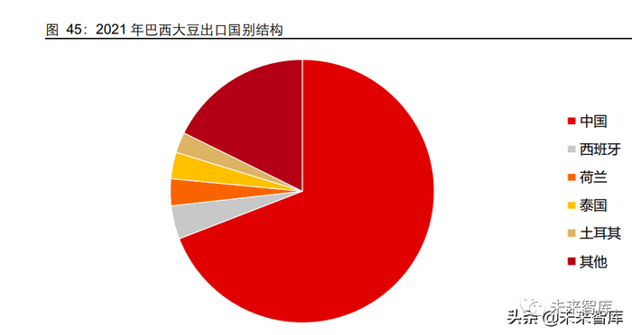21/22 年度 USDA 预测巴西大豆出口量为 8600 万吨,同比增加 5%。由于干旱造成南 美减产,USDA 在 3 月调低了巴西大豆的出口预测。本年度来看,由于美豆价格较高, 以及 21 年 8 月底的艾达飓风造成了美豆装货延迟,21/22 年度中国减少了部分对于美 国大豆的购买,转而增加了对巴西大豆的采购,从而使得巴西大豆出口有所增加。中国 是巴西大豆的最大出口目的地国,根据巴西海关数据,2021 年巴西向中国出口大豆净 重达到 6000 万吨。