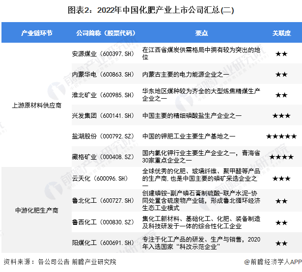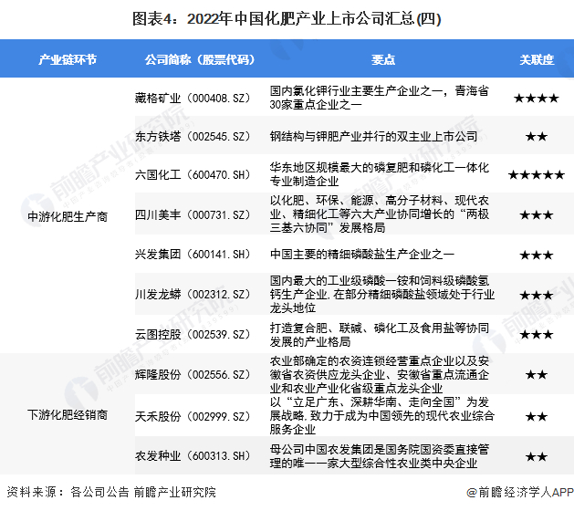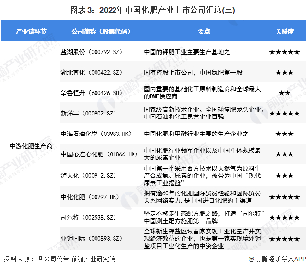 化肥产业链各环节上市公司:上游原材料供应上市企业有内蒙华电(600863.SH)、淮北矿业(600985.SH)、兴发集团(600141.SH)、盐湖股份(000792.SZ)、藏格矿业(000408.SZ)等;中游化肥生产上市企业主要有云天化(600096.SH)、鲁北化工(600727.SH)、鲁西化工(000830.SZ)、阳煤化工(600691.SH)、盐湖股份(000792.SZ)、湖北宜化(000422.SZ)、华鲁恒升(600426.SH)、新洋丰(000902.SZ)、泸天化(000912.SZ)、司尔特(002538.SZ)、亚钾国际(000893.SZ)、藏格矿业(000408.SZ)、东方铁塔(002545.SZ)、六国化工(600470.SH)、四川美丰(000731.SZ)、兴发集团(600141.SH)、川发龙蟒(002312.SZ)、云图控股(002539.SZ)等;下游化肥经销上市企业有辉隆股份(002556.SZ)、天禾股份(002999.SZ)、农发种业(600313.SH)等