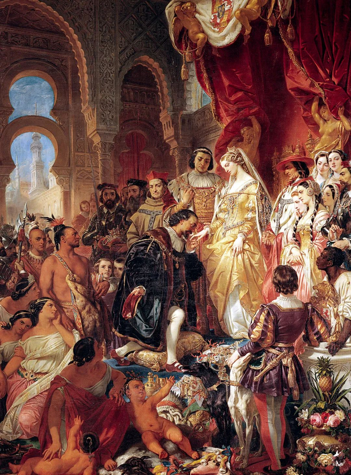 1493年,西班牙伊莎贝拉女王和夫婿费尔南多国王在哥伦布第一次航行回国后接见了他。哥伦布向君主展示了从新大陆带回的土著、植物和食物。