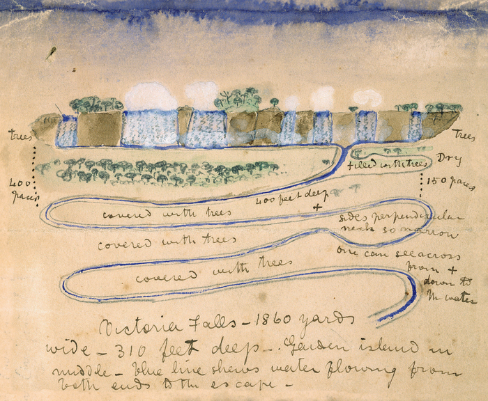 利文斯通创作的维多利亚瀑布水彩素描,附带文字则是其目睹景观的介绍
