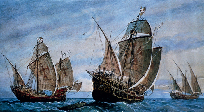 哥伦布的旗舰圣玛利亚号(中)与另两艘帆船平塔号和妮娜号。