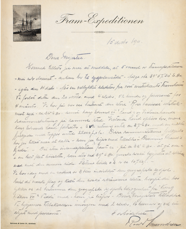 阿蒙森首登南极点次日后给挪威国王的一封信