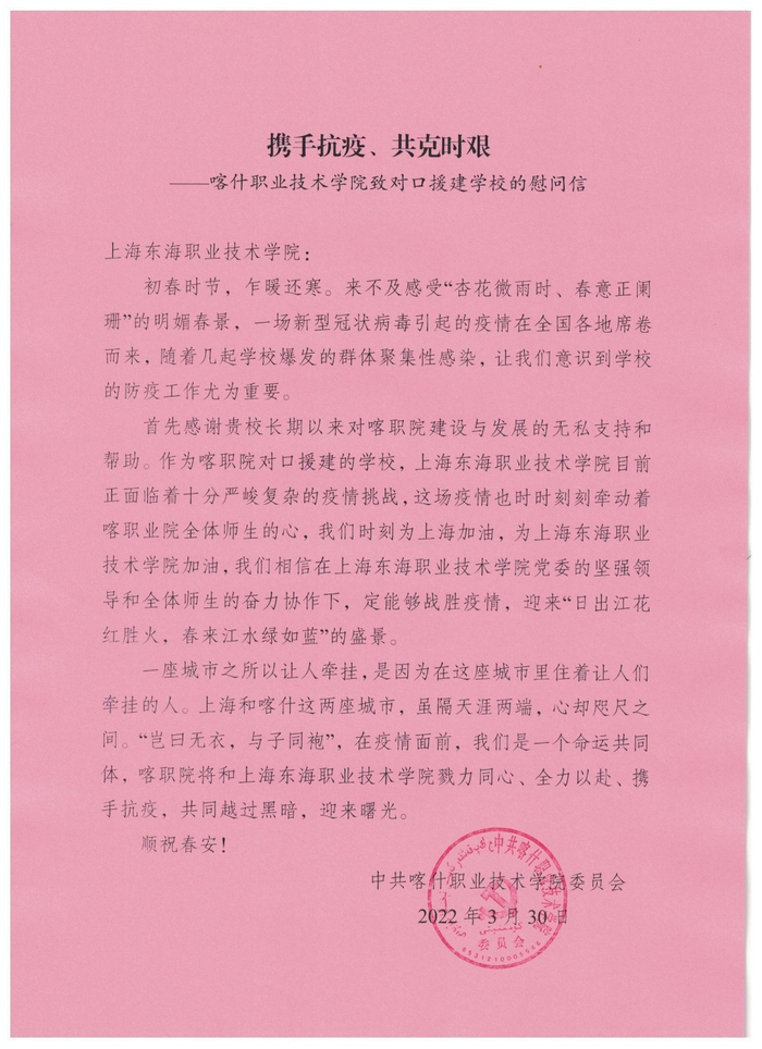 4月1日,上海东海职业技术学院党委收到喀什职业技术学院党委发来慰问信,字里行间流露出对身处严峻疫情之中东海学院全体师生的深刻关切。信中说:“一座城市之所以让人牵挂,是因为这座城市里住着让人们牵挂的人。”“喀什职院将和上海东海职业技术学院勠力同心、全力以赴、携手抗疫,共同越过黑暗,迎来曙光!”