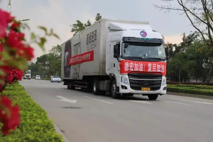 4月9日中午,一辆重型货车缓缓停在复旦大学校门前,车上挂着条幅:“德宏加油,复旦加油”。