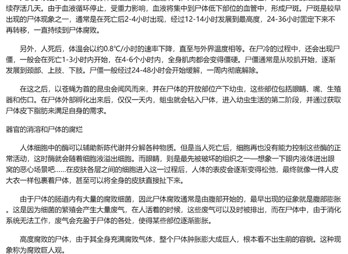 同时,对尸体的清洗并不容易,即使是重症在床的病人也不会丧失调动肌群的能力,能稍微配合家属或护工的翻身动作,而尸体的肌肉早已松散,动作稍微一重就会扯坏皮肤,会引起死者家属不满不说,尸体撕裂流出的高腐液体、气体都会威胁工人的健康。