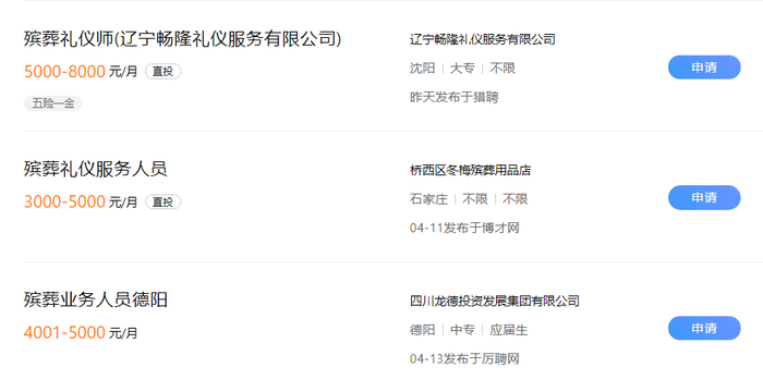 在招聘网站上的搜索“殡葬礼仪师”,各地的薪资也普遍在这一水平。