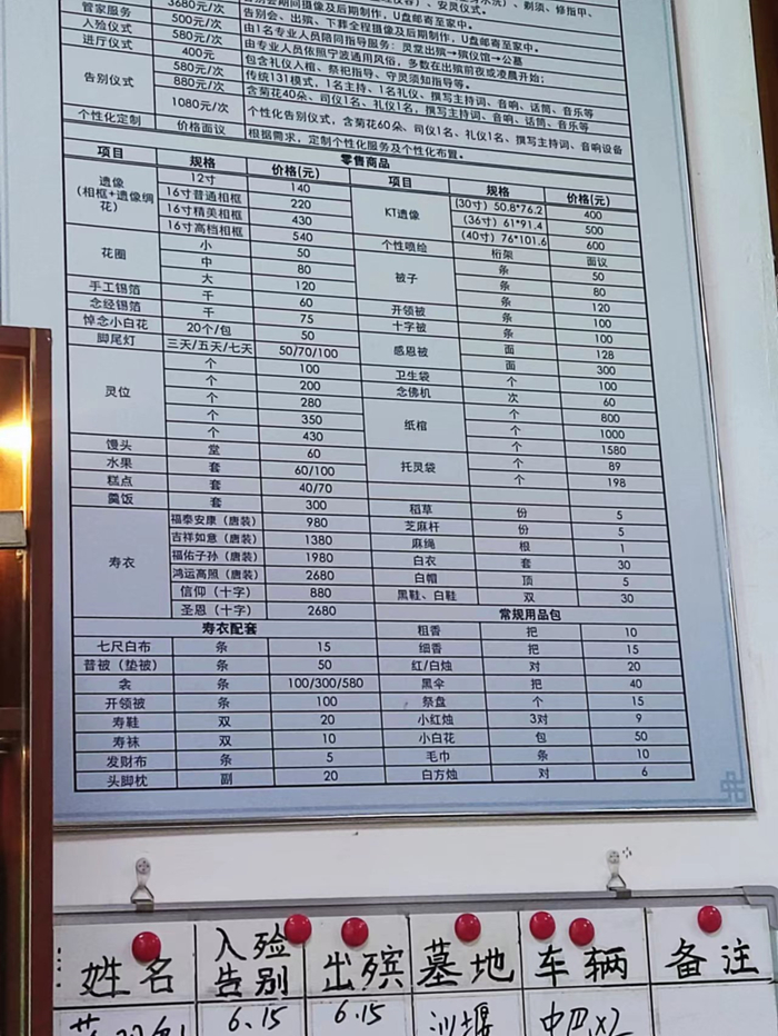 比如这次北医三院的那张清单里,寿衣的价格高达6800,花圈的价格总计接近一万。但实际上,这样的价格在殡葬行业并不多见,小李告诉《风暴眼》记者,寿衣的价格普遍在几百元到上千元之间,不过普遍质量类似于纸衣,当然也有客户会选择几千甚至上万的定制寿衣,还有花十几万用名贵木材定制骨灰盒的,这个根据客户需求价格不等,“但正常流程普通人肯定消费得起”。