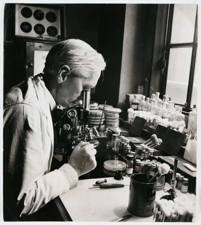 图3 细菌学家亚历山大·弗莱明在使用显微镜观察培养皿上的菌落,他因在1928年发现了抗生素青霉素而闻名于世。| 图源:Science & Society Picture Library