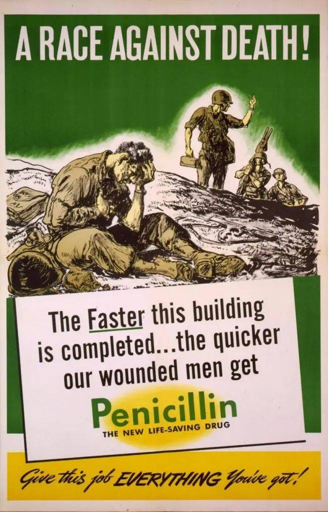 图4 美国陆军部于1942至1945年间制作的“与死亡赛跑”的宣传海报。海报上写着:“越快建成这栋大楼,受伤的军人们便会越早获得能拯救他们生命的神奇药物——青霉素。”| 图源:Library of Congress