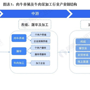 中国肉牛养殖及牛肉深加工行业上游原材料供应企业主要以新希望、海大集团、温氏饲料等为代表;中游养殖、屠宰及加工企业主要以福成股份、恒都集团、科尔沁牛业、秦宝牧业等为代表;下游消费市场企业则较为广泛,代表企业有海底捞、广州酒家等餐饮企业以及华润万家、大润发等商超。