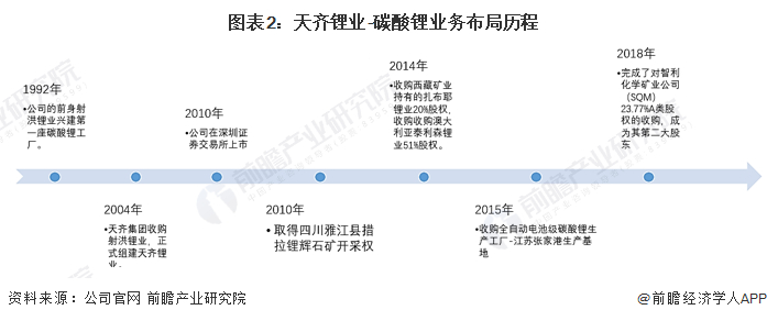 天齐锂业的前身为四川射洪锂业,1992年射洪锂业兴建了第一座碳酸锂工厂。2004年,天齐集团成功收购射洪锂业,正式组建天齐锂业。经过几年的发展,天齐锂业在深交所成功挂牌上市。随着公司上市后融资渠道拓宽,公司在接下来几年开始数起并购,其中包括收购澳大利亚泰利森锂业51%股权,收购江苏张家港生产基地,收购SQM公司23.77%股权等。