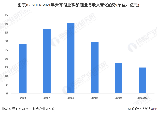 从碳酸锂业务的经营情况来看,2018年后,天齐锂业的锂化合物及衍生品业务营收逐年下降。2020年,天齐锂业的锂化合物及衍生品业务实现收入17.57亿元。2021年上半年,天齐锂业的碳酸锂业务实现收入14.87亿元。