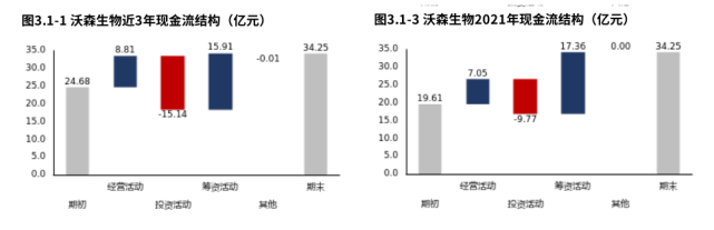来源:市值参谋@和恒数据维度三 现金流健康程度从现金流结构出发分析公司整体现金周转情况,再分别对公司的经营活动、投资活动、筹资活动和分红的现金流动情况进行分析,对公司现金流健康性进?判断。从沃森?物2019年报到本期的现?流结构来看,期初现?24.68亿元,经营活动净流?8.81亿元,投资活动净流出15.14亿元,筹资活动净流?15.91亿元,其他现?净流出133.45万元,三年累计净流?9.57亿元,期末现?34.25亿元。