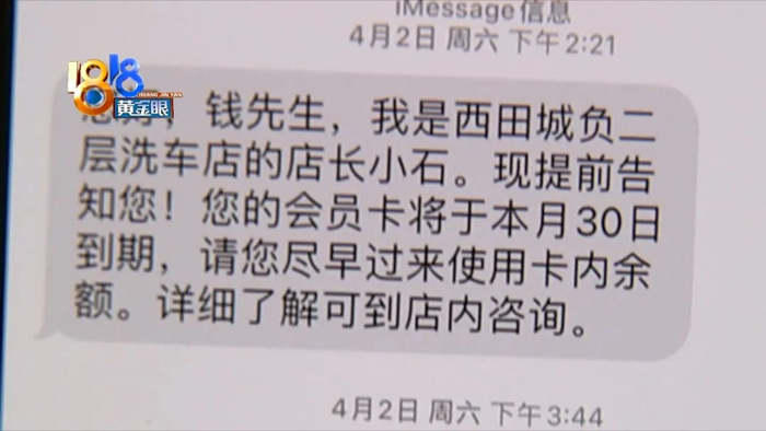钱先生开的是辆别克轿车,他说自己一般两个月洗一次车,西田城离家不算很近,但想着来逛商场可以顺便洗一下,就办了卡。当天洗车的99块钱免掉了。今年4月2号,他接到洗车店石店长发来的短信,说他的这张卡4月30号要到期,请尽早过来使用卡内余额。