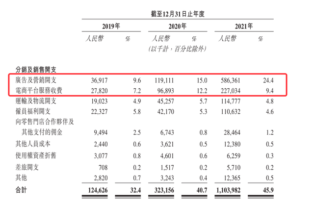 为打造品牌,蕉下确实也下了血本。据招股书数据,蕉下的广告及营销开支自2019年至2021年逐年递增,2021年,蕉下的广告及营销开支占总收入的24.4%,达5.86亿元。