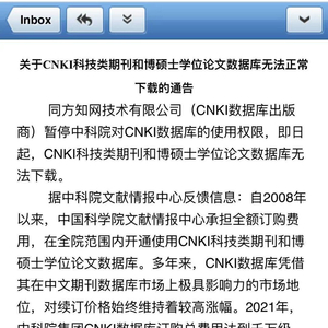 近日,一则落款为中国科学院“文献信息中心”的邮件在网上流传。该邮件指责知网近“千万级别”的续订费用和“苛刻”的续订条件,并表示因谈判无法达成一致,目前中国知网已暂停中国科学院(以下简称“中科院”)对CNKI数据库的使用权限。
