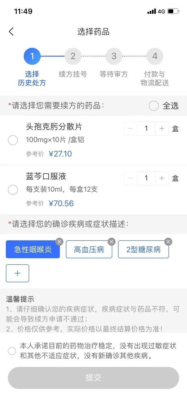 有近期“6个月内线下就诊记录”的患者,通过历史处方可在线申请配药。