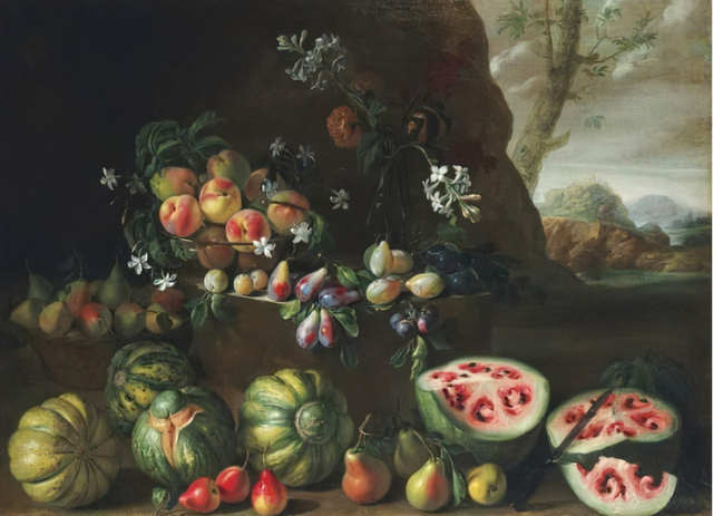 乔瓦尼·斯坦奇(1608—1675),《一幅风景画中的西瓜、桃子和梨》(《艺术与科学:从野生茄子到三宅一生》插图)
