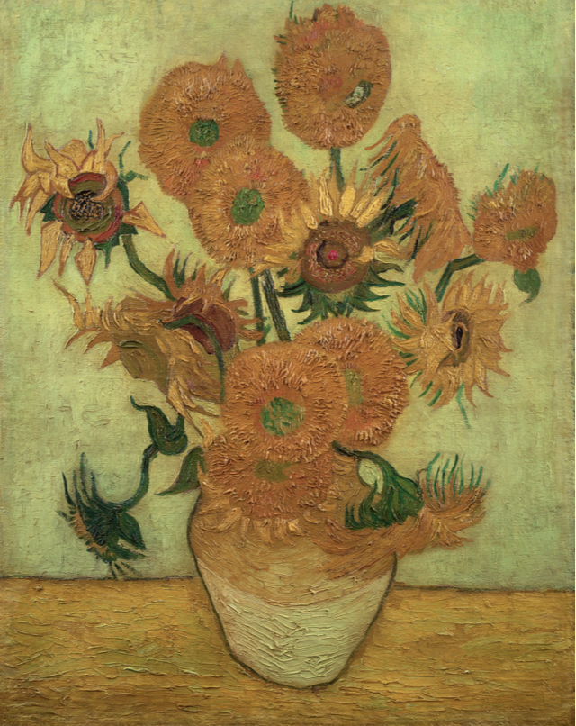 1888年2月20日,文森特·梵·高(1853—1890)在阿尔勒定居。在这一年的8月,他画了《向日葵》系列中的第一幅。1889年1月,他完成了另外三幅,至此,由四幅画组成的系列作品大功告成。每一次作画时,他会把3到15支向日葵放在一个瓶子里,瓶子则被置于黄色或蓝色的底布上。有些原本是拿来装饰保罗·高更(Paul Gauguin)房间的,他在1888年前来和这位荷兰画家相聚。此外,高更的一幅作品表现了正在画一束向日葵的梵·高。