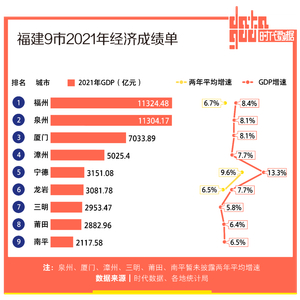 与此同时,福建省9座城市2021年经济成绩单也全部揭晓,经济总体呈现平稳增长态势,实现了“十四五”良好开局。其中,福州GDP二十多年来首次超越泉州,成为全省第一;宁德经济增速亮眼,GDP同比增长13.3%,两年平均增长9.6%,领跑全省。